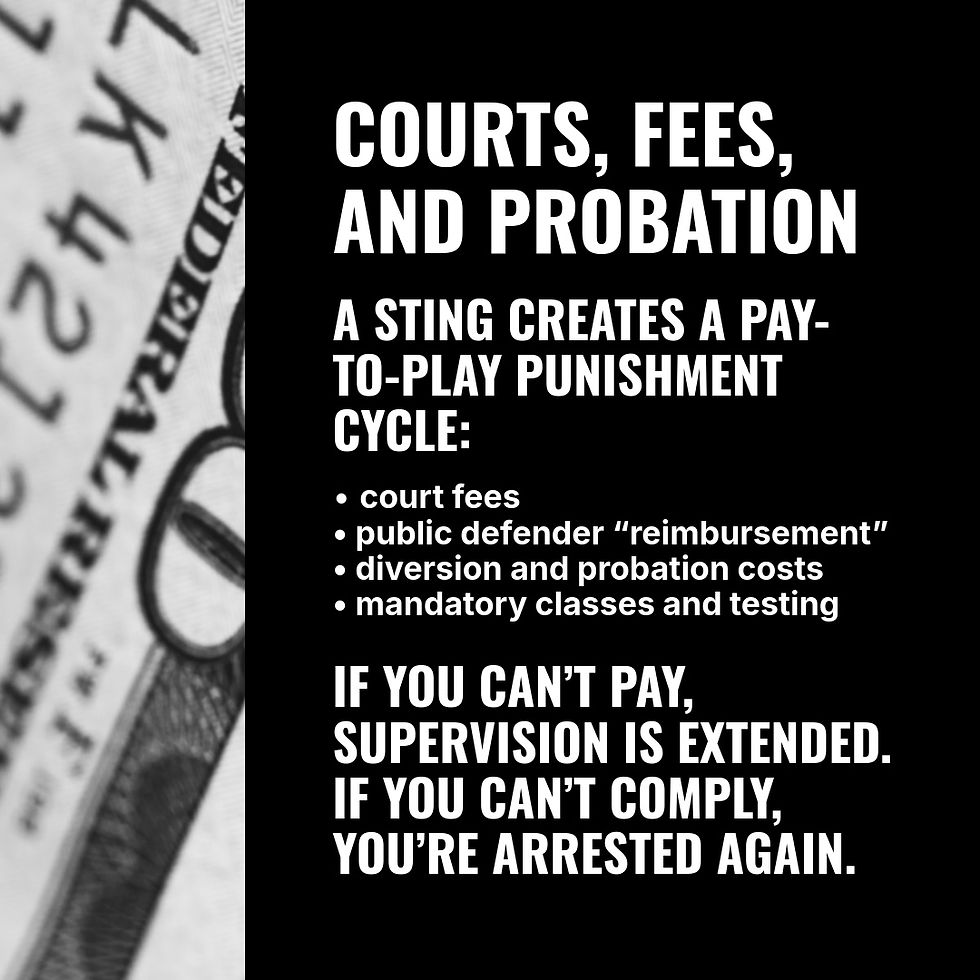 Court involvement brings a cascade of additional financial obligations. A single sting can saddle someone with court fees, public defender “reimbursement,” diversion program fees, probation supervision costs, mandated therapy or classes, drug testing, and required participation in “john school” or trafficking survivor programs. These interventions are marketed as alternatives to incarceration, but in practice they are pay-to-play systems that punish poverty. If you can’t afford the fines, your probation is extended. If you can’t afford probation, you get arrested again. A sting creates its own self-funding punishment cycle.