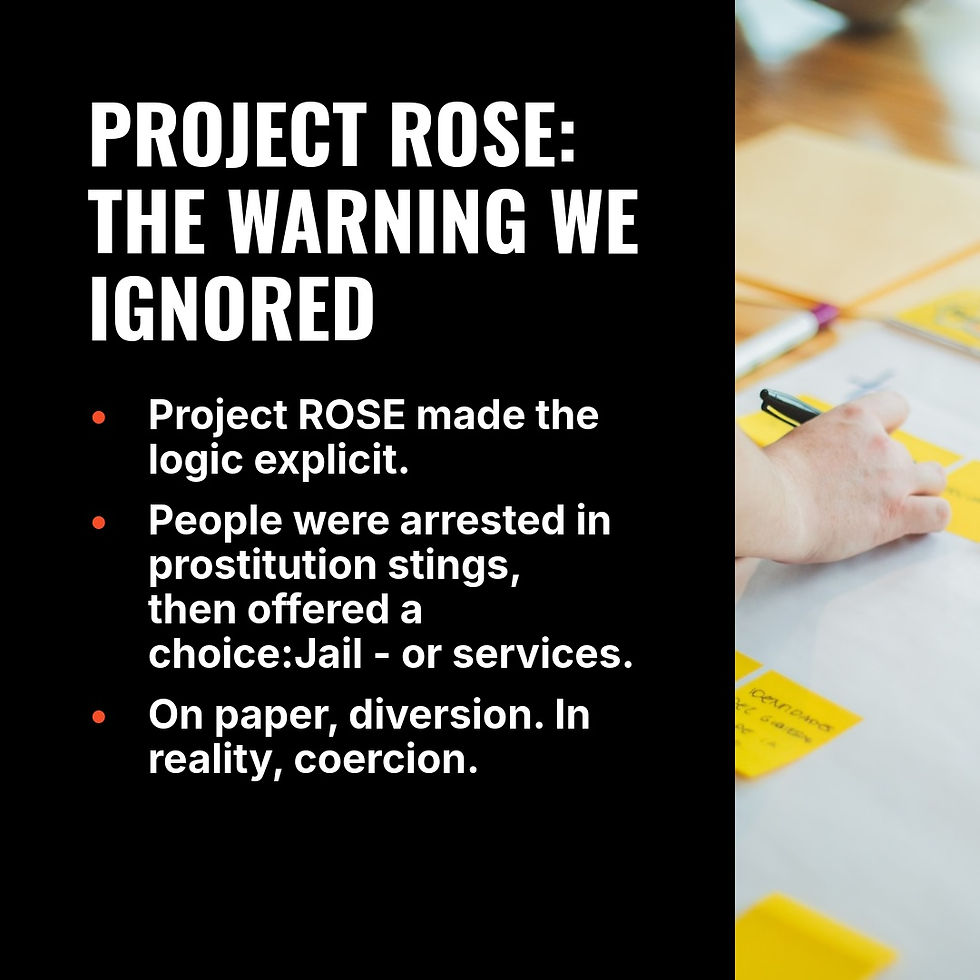 Arizona’s Project ROSE made the logic explicit long before Selah Freedom or One More Child scaled nationally. Under Project ROSE, people - primarily poor women, disproportionately Black and trans - were arrested in prostitution stings and then offered a choice: jail or services.